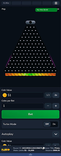 Open Plinko: Click the menu button and select "Casino." Type in “Plinko" in the search bar and select the game. Click “Play" to play with real money or select “Play for Free" for demo mode.